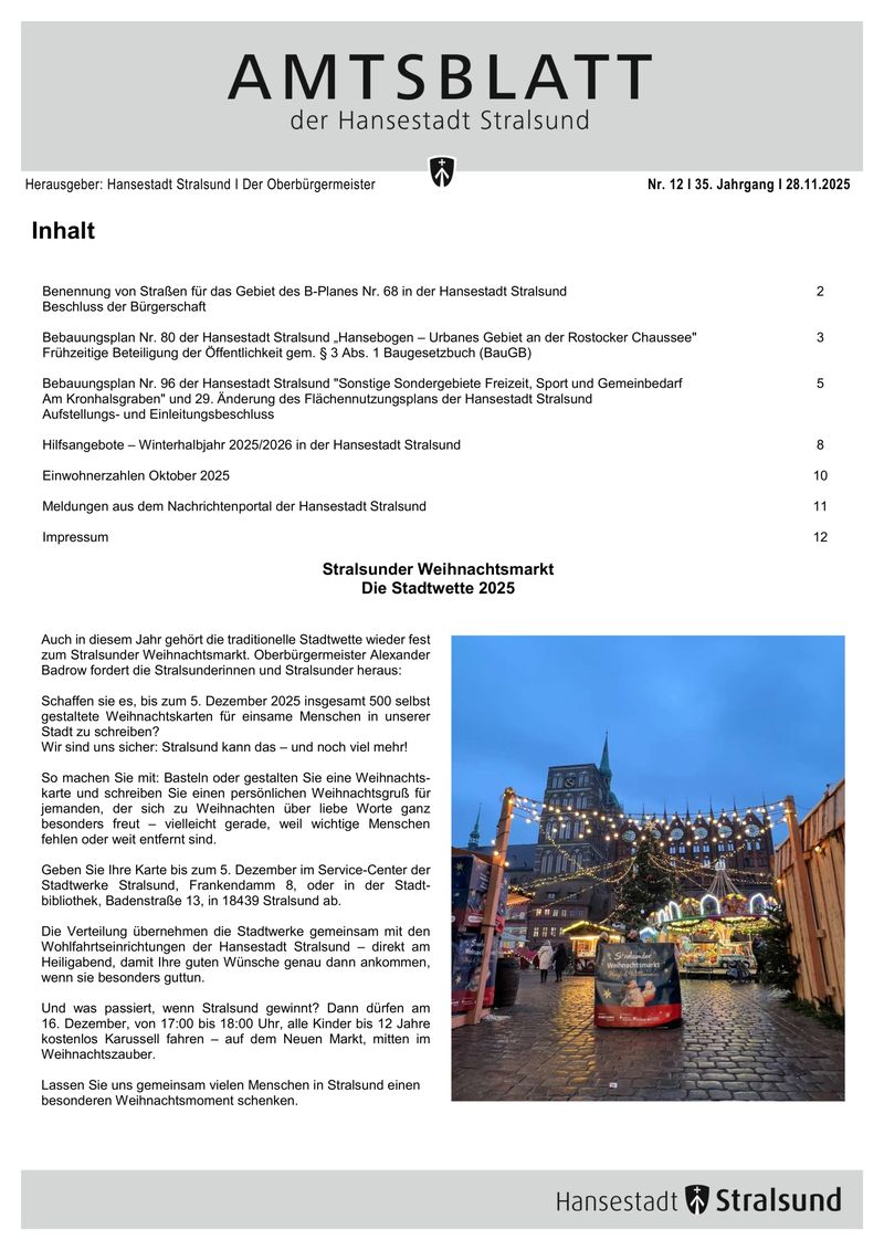 Außerdem im Amtsblatt: die Hilfsangebote für obdachlose Menschen im Winterhalbjahr 2025/2026 in der Hansestadt Stralsund sowie die aktuellen Einwohnerzahlen.